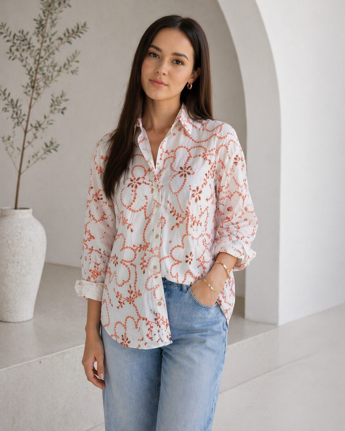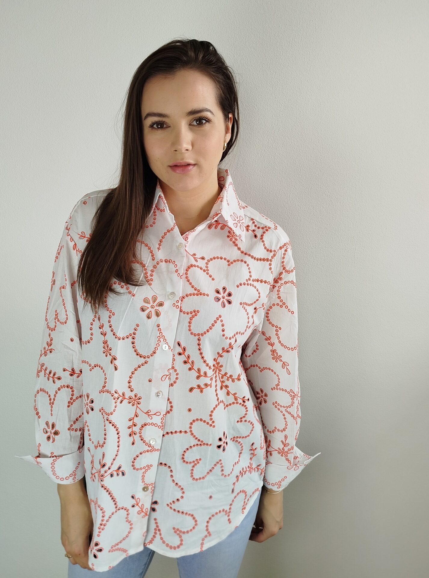 Ľahká, vzdušná košeľa . Mierne dierkovaná s jemným vzorom. Košeľa je voľného strihu vhodná na každodenné nosenie