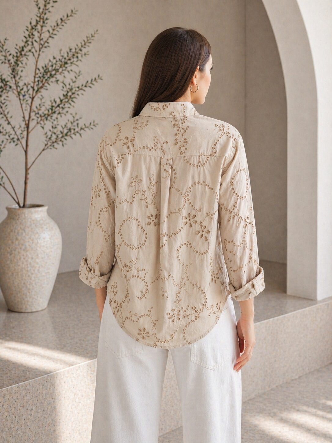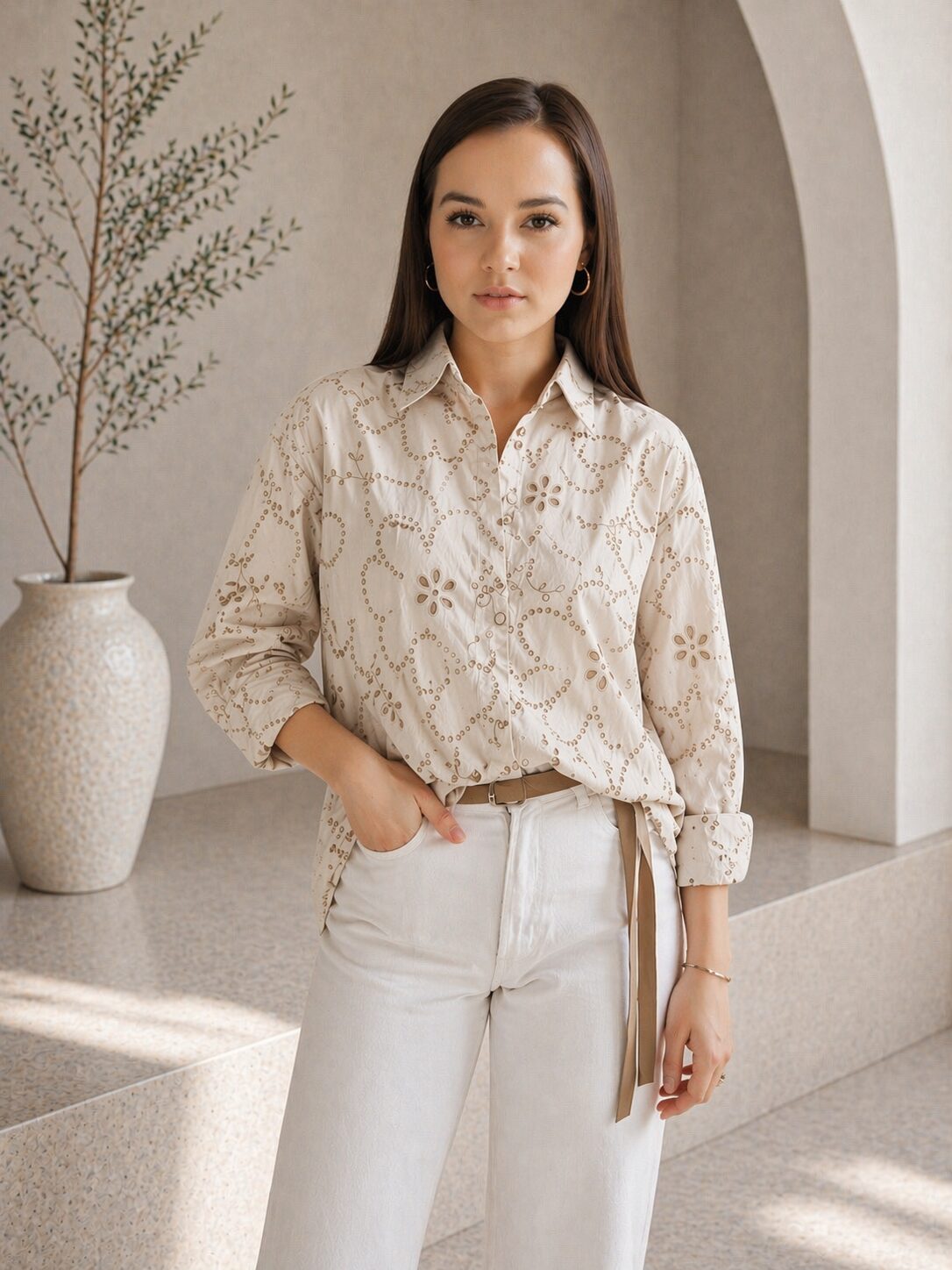 Ľahká, vzdušná košeľa . Mierne dierkovaná s jemným vzorom. Košeľa je voľného strihu vhodná na každodenné nosenie