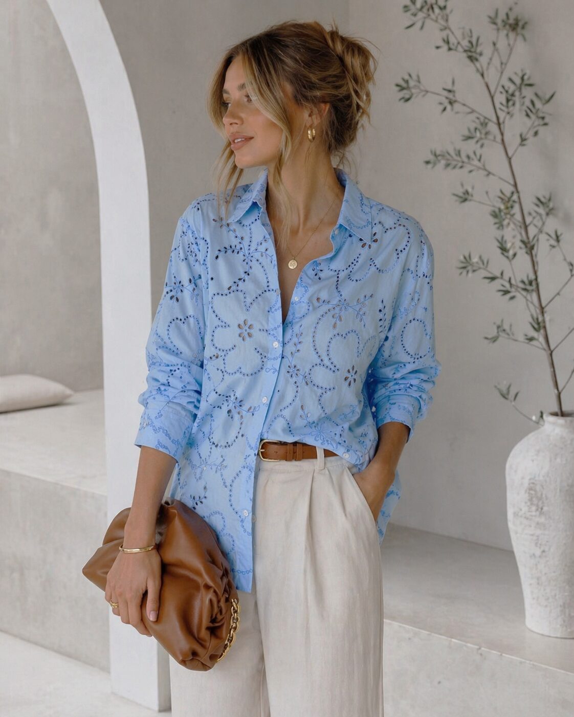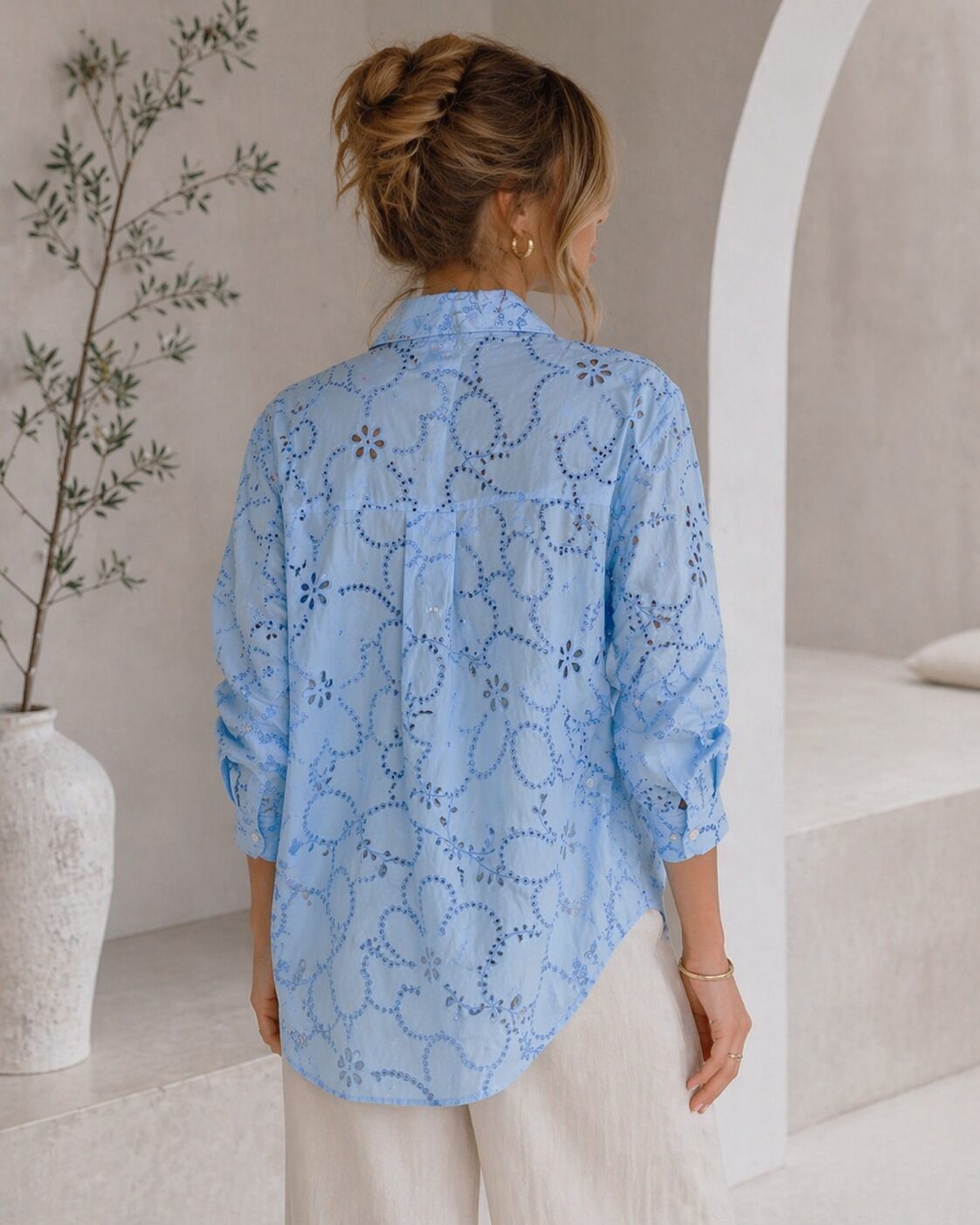 Ľahká, vzdušná košeľa . Mierne dierkovaná s jemným vzorom. Košeľa je voľného strihu vhodná na každodenné nosenie