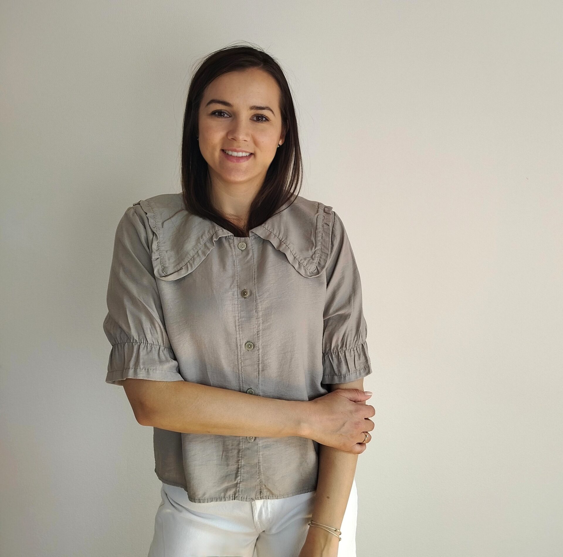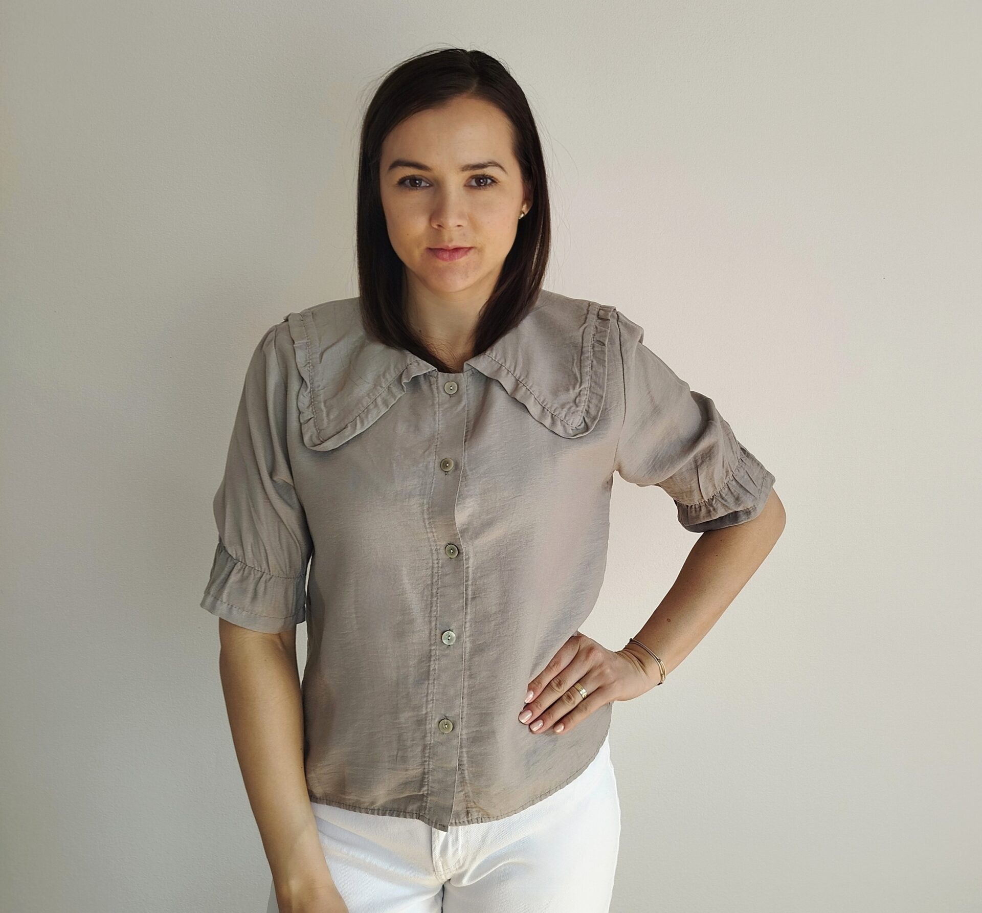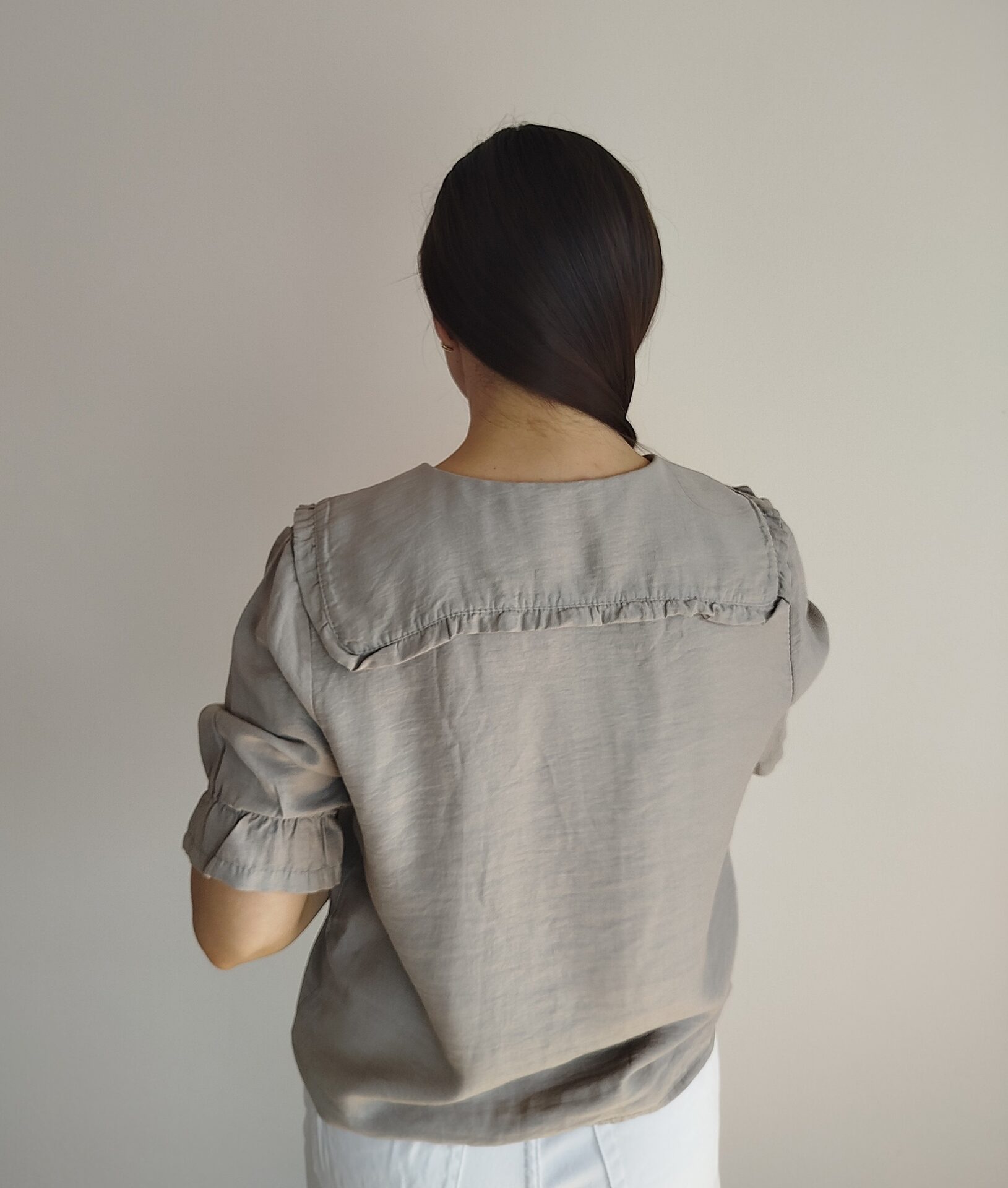 Blúzka v elegantnom a romantickom štýle s výrazným golierom v prednej aj zadnej časti. Rukávy po lakte s gumičkou a volánikom. Ľahký a vzdušný materiál