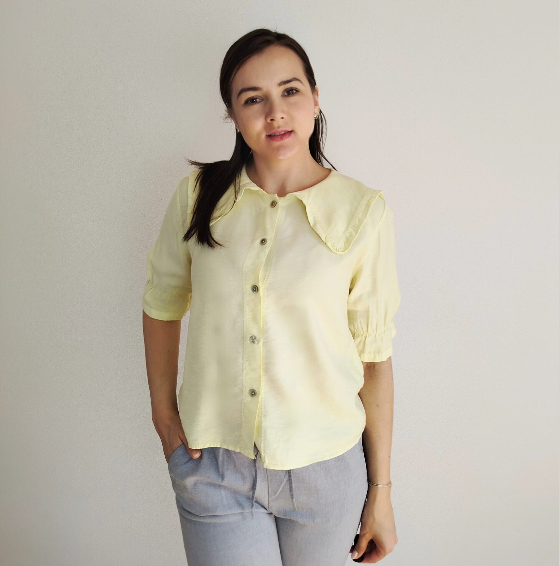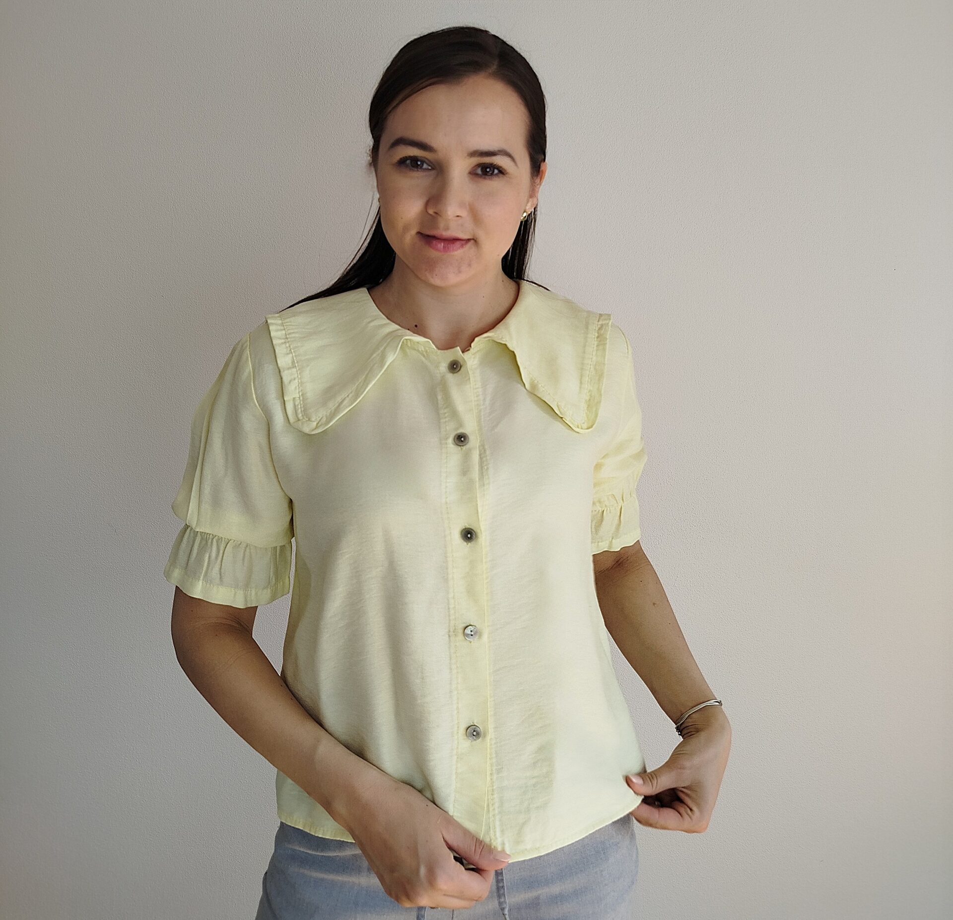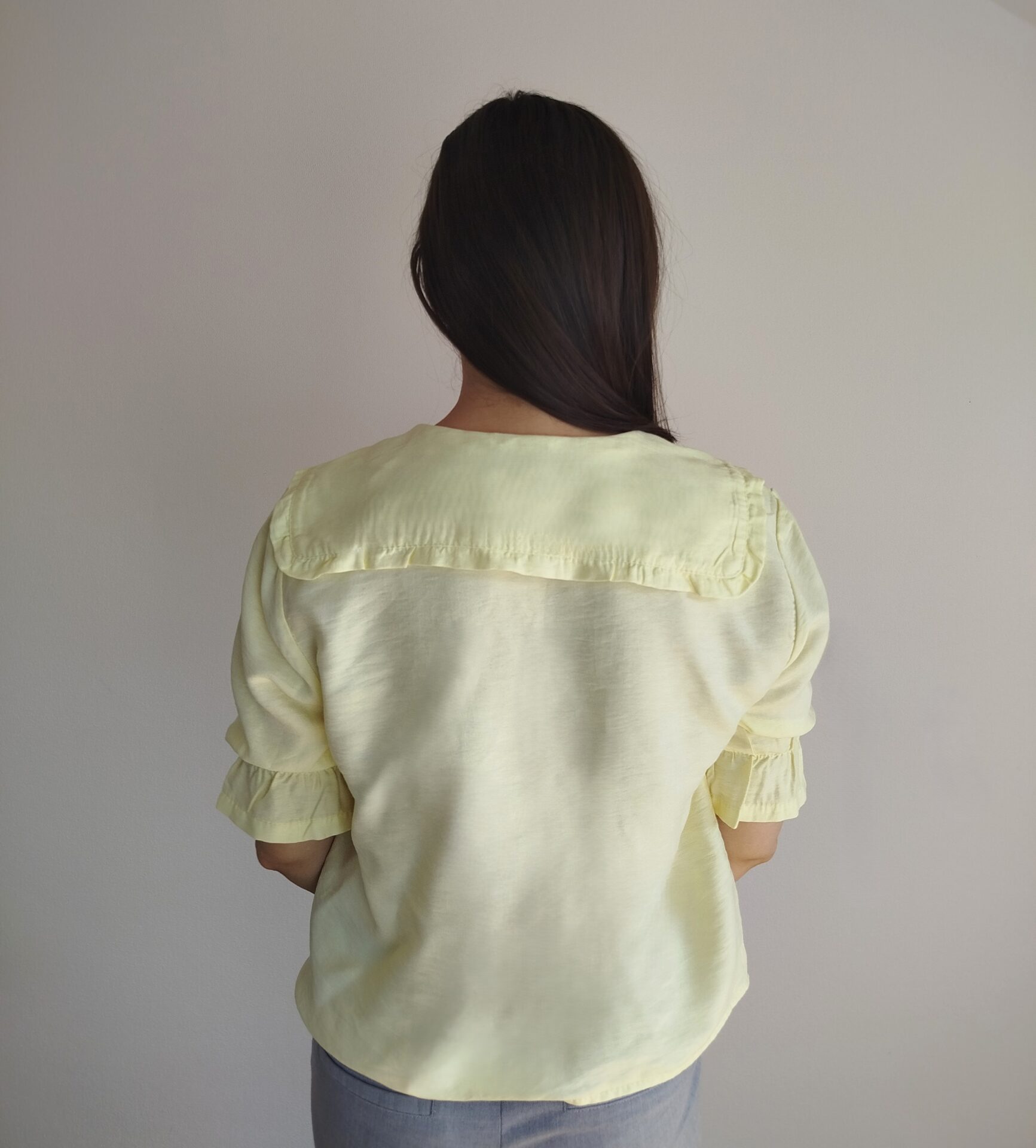Blúzka v elegantnom a romantickom štýle s výrazným golierom v prednej aj zadnej časti. Rukávy po lakte s gumičkou a volánikom. Ľahký a vzdušný materiál