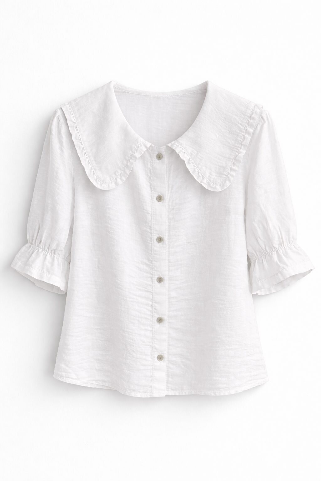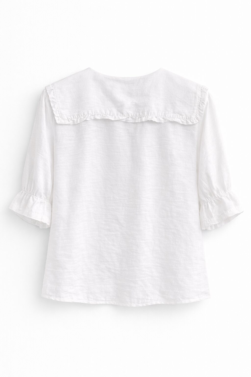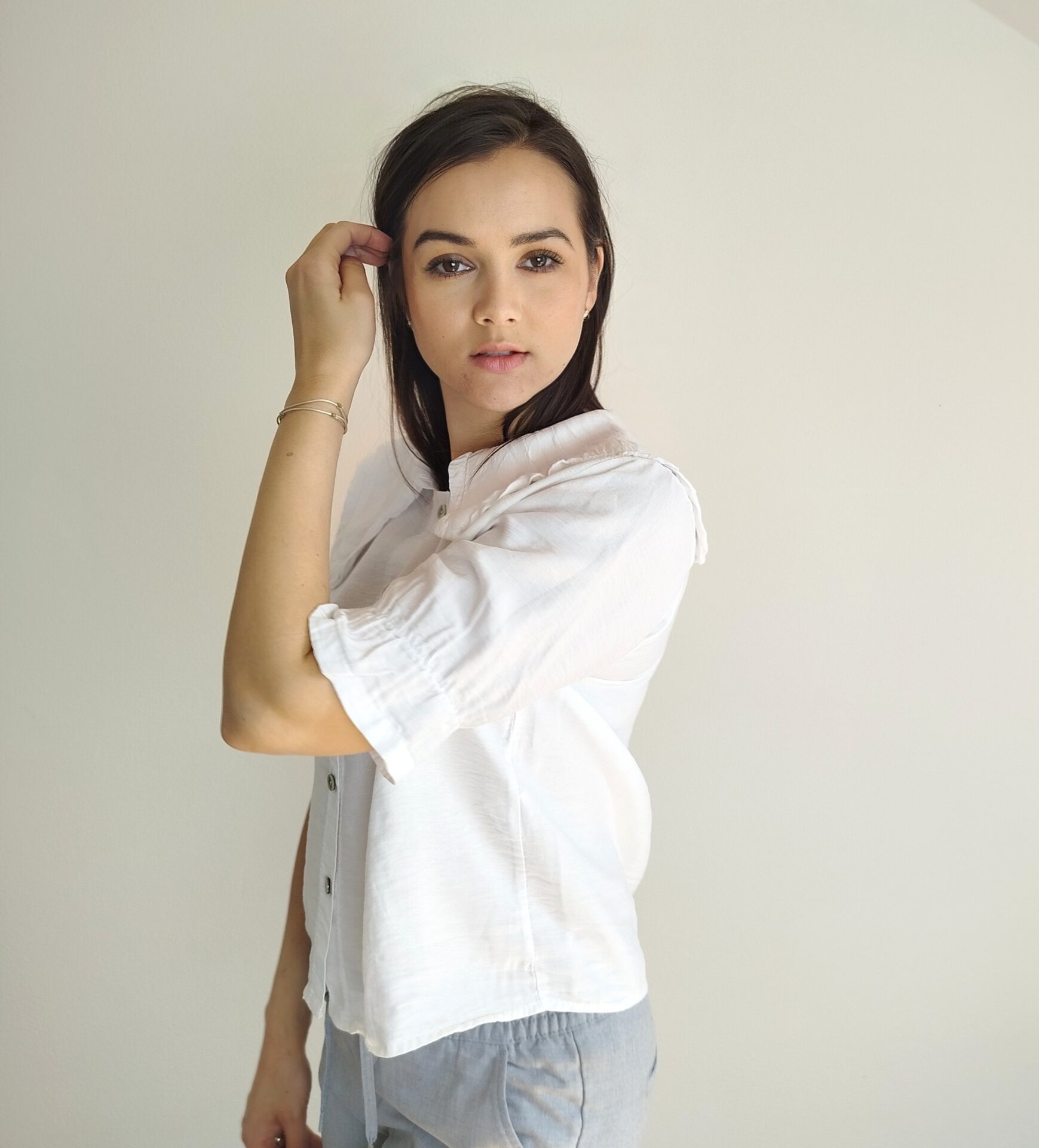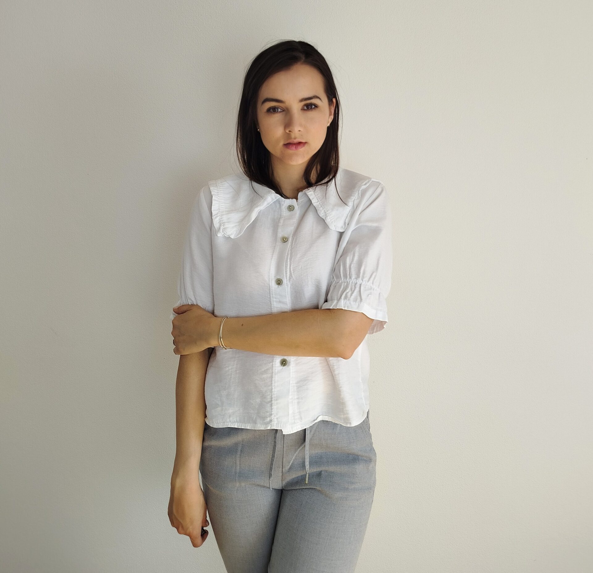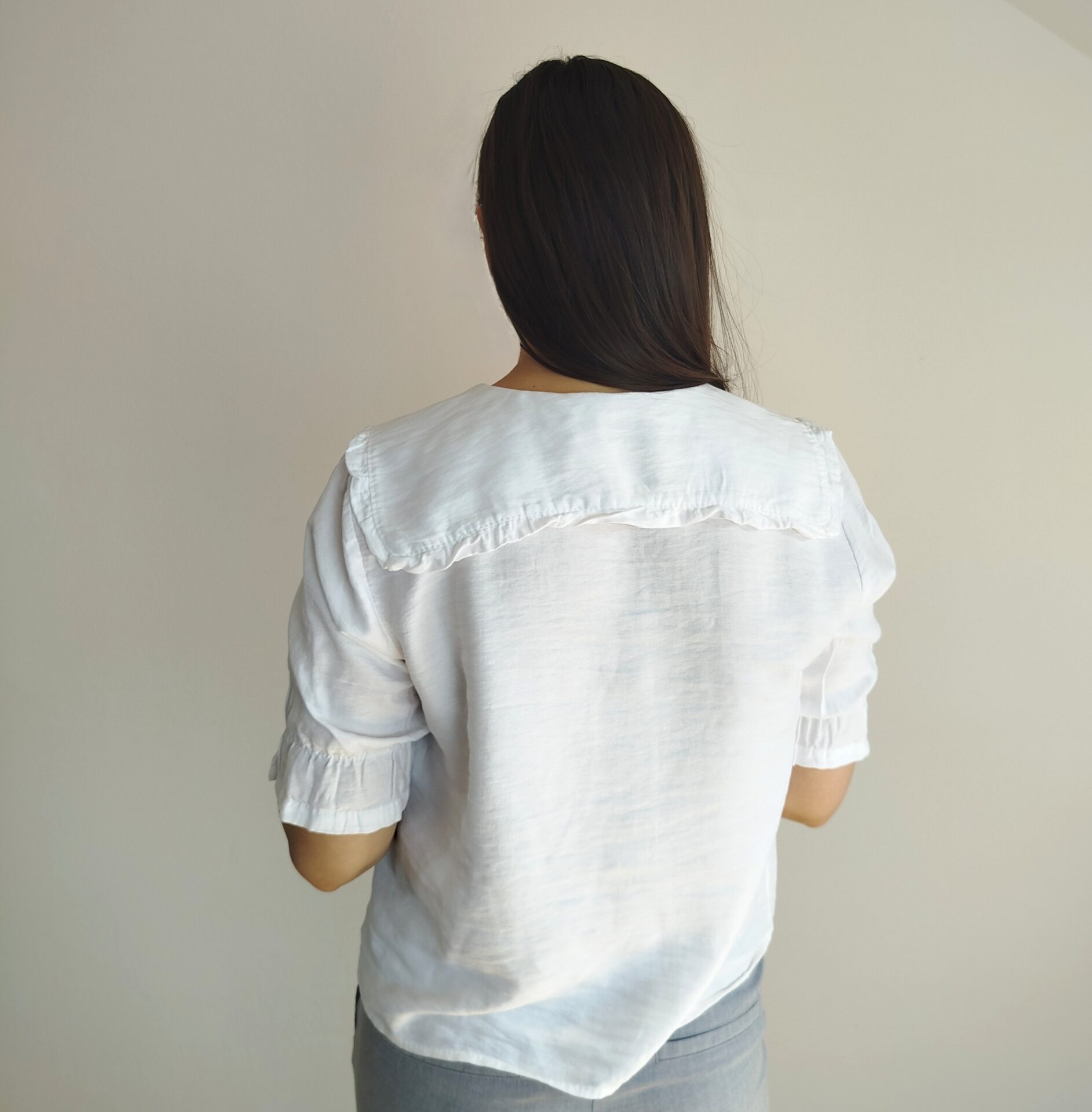 Blúzka v elegantnom a romantickom štýle s výrazným golierom v prednej aj zadnej časti. Rukávy po lakte s gumičkou a volánikom. Ľahký a vzdušný materiál