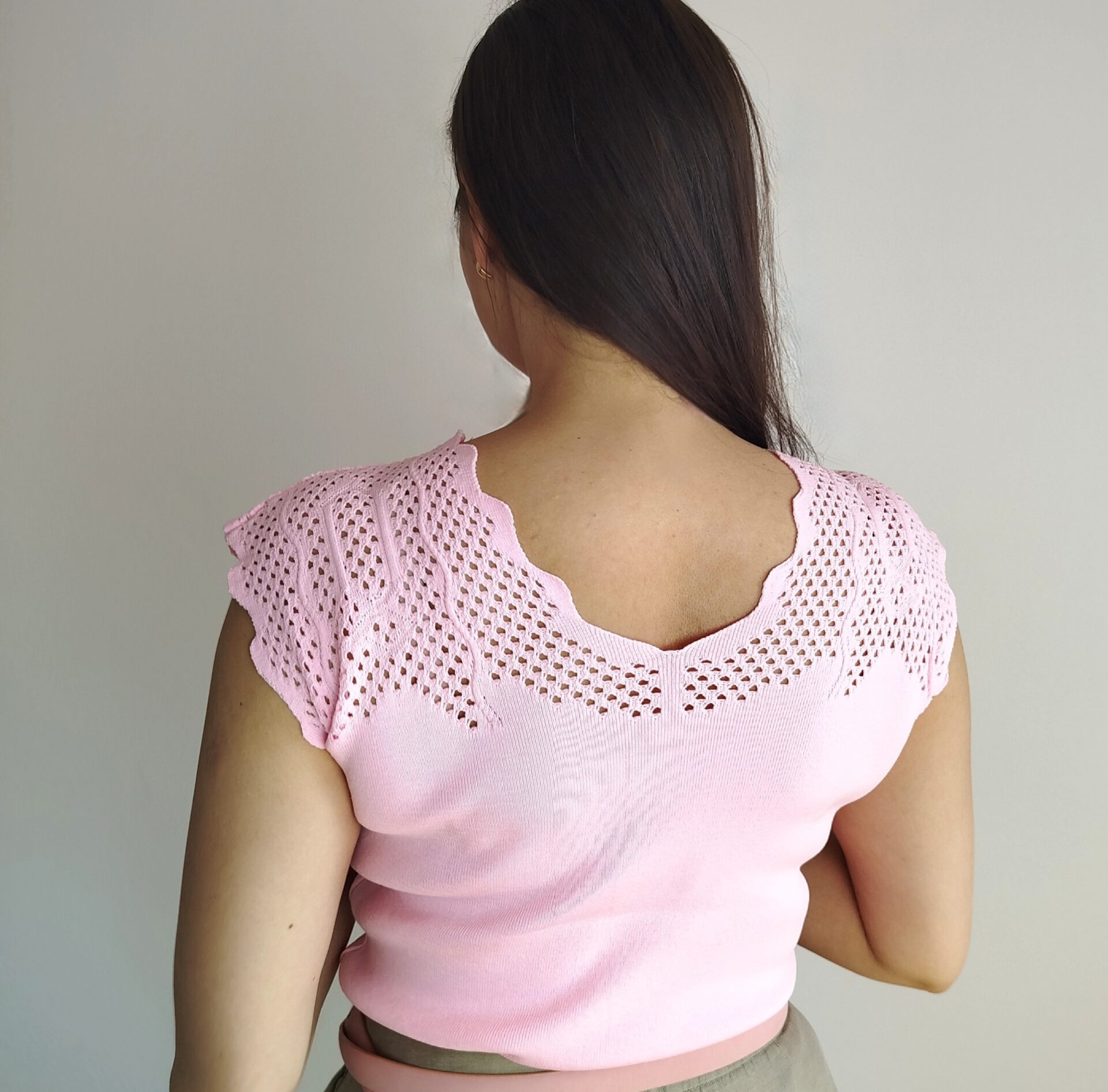 Jednoduchý a kvalitný top s moderným lemovaním okolo krku a ramien. Výstrih do V. Žensky kúsok ktorý sa ľahko kombinuje.