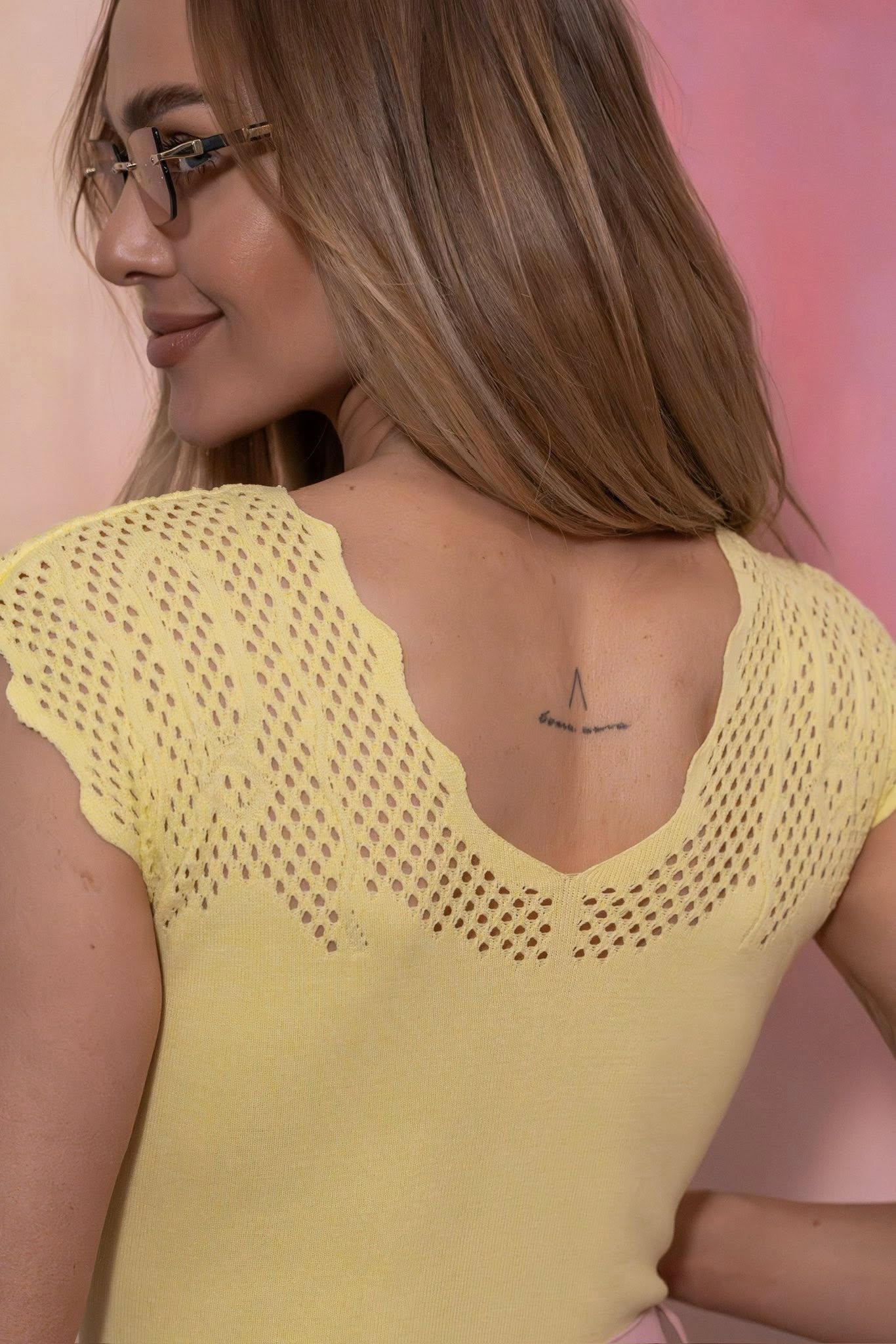 Jednoduchý a kvalitný top s moderným lemovaním okolo krku a ramien. Výstrih do V. Žensky kúsok ktorý sa ľahko kombinuje.