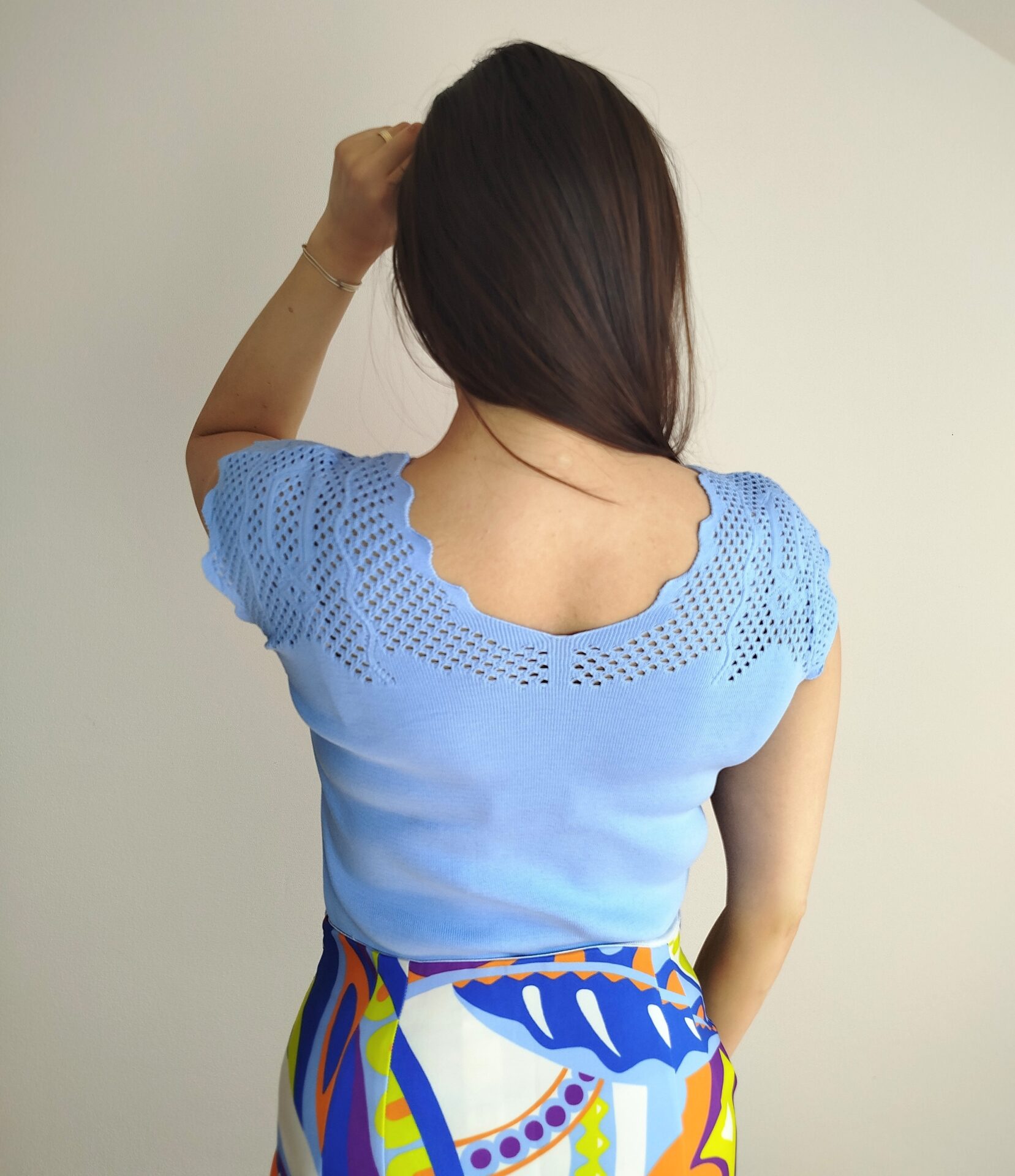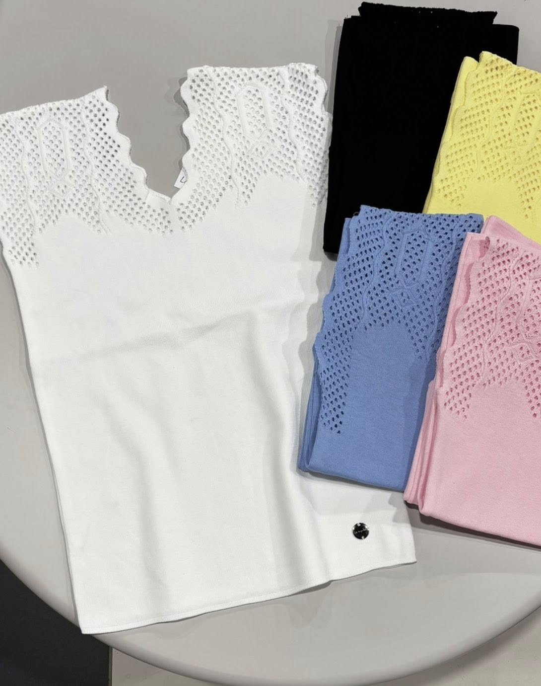 Jednoduchý a kvalitný top s moderným lemovaním okolo krku a ramien. Výstrih do V. Žensky kúsok ktorý sa ľahko kombinuje.