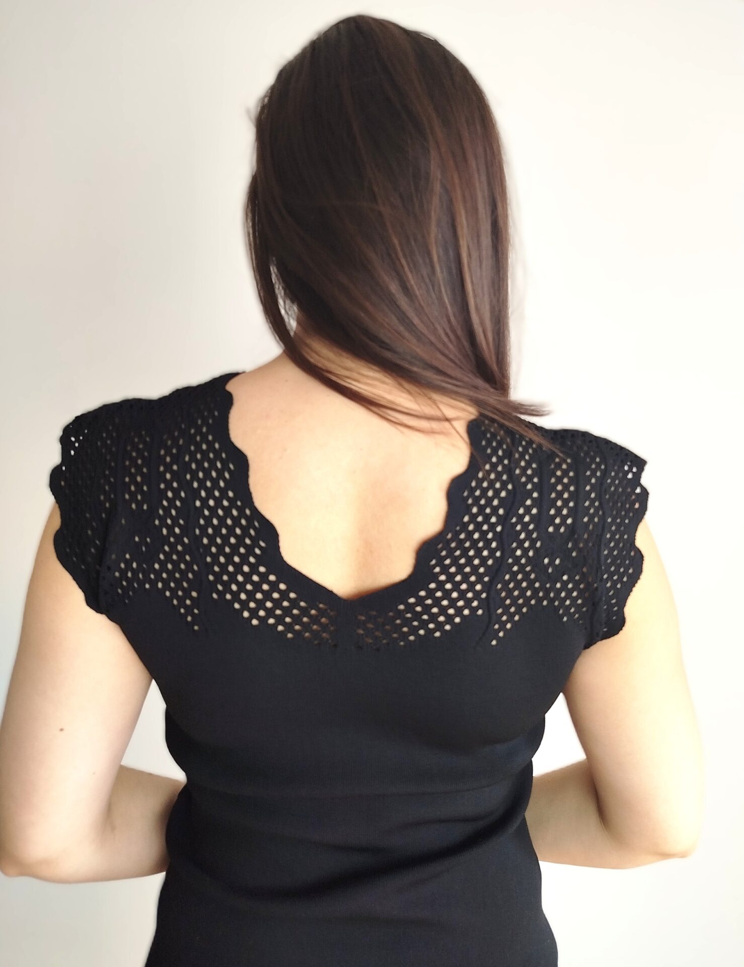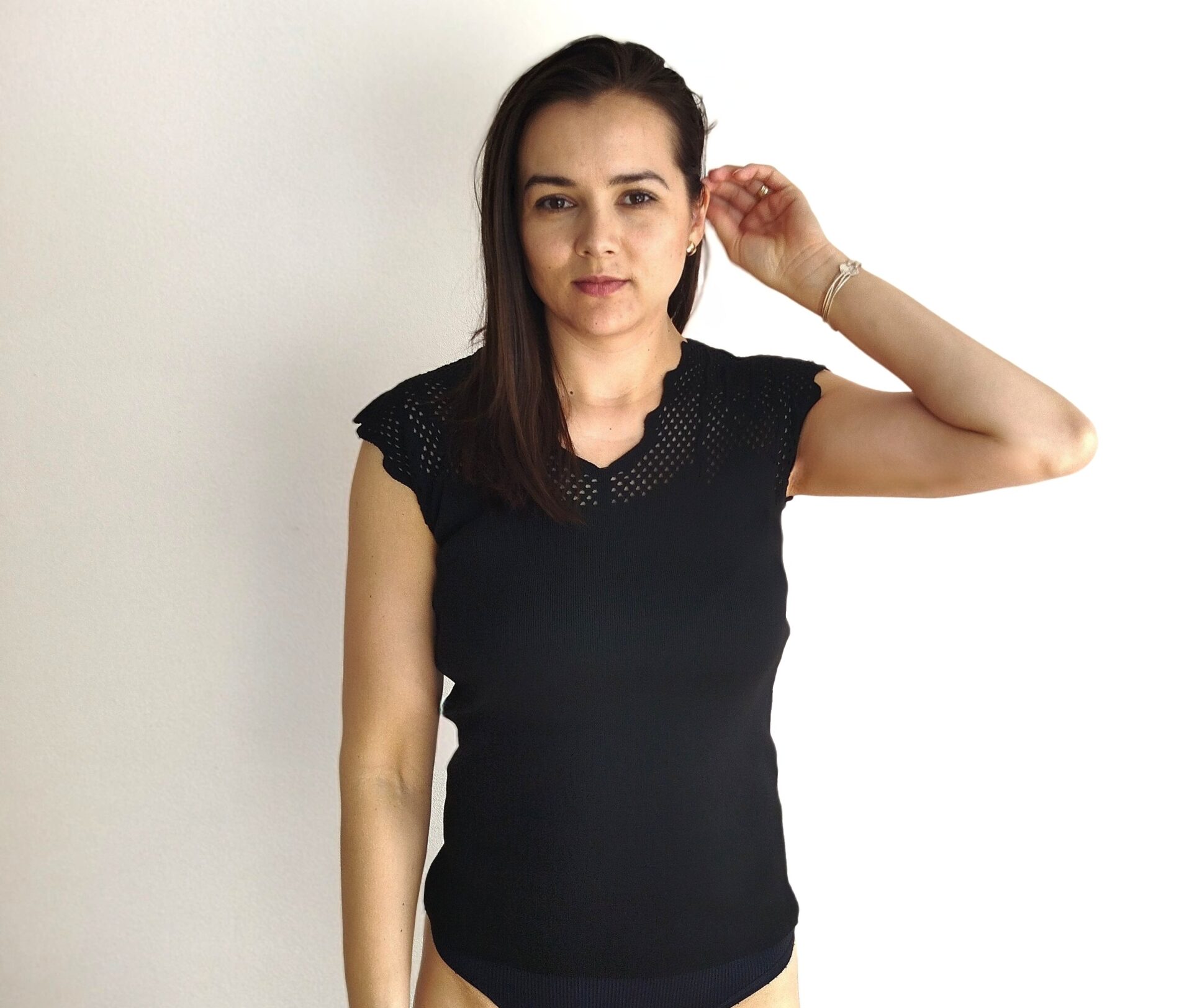 Jednoduchý a kvalitný top s moderným lemovaním okolo krku a ramien. Výstrih do V. Žensky kúsok ktorý sa ľahko kombinuje.
