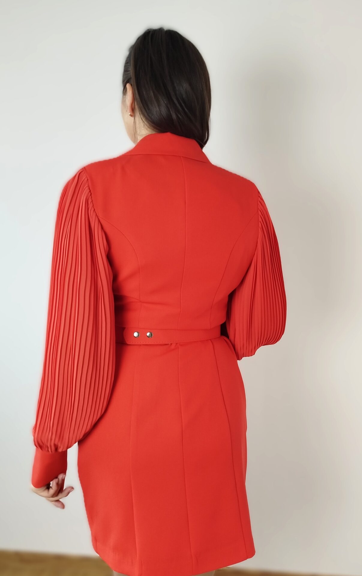 Sakové šaty s výstrihom do V, s opaskom a balónovými plisé rukávmi.