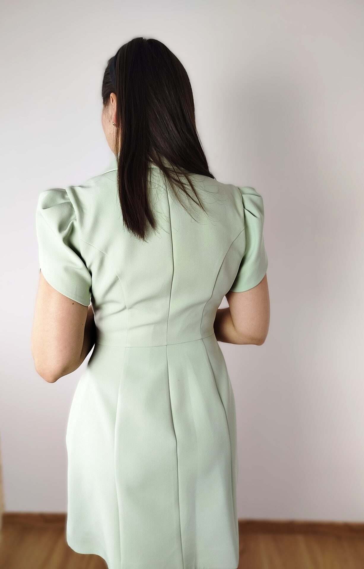 Šaty sú jednoduché so sakovým véčkovým výstrihom a prekladaným rukávom.